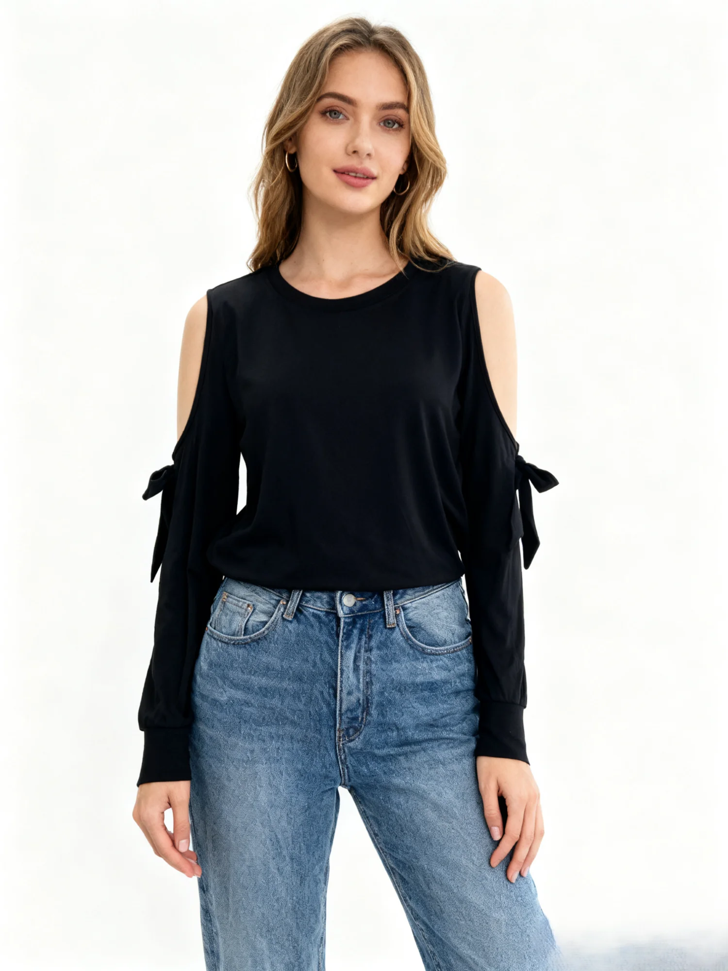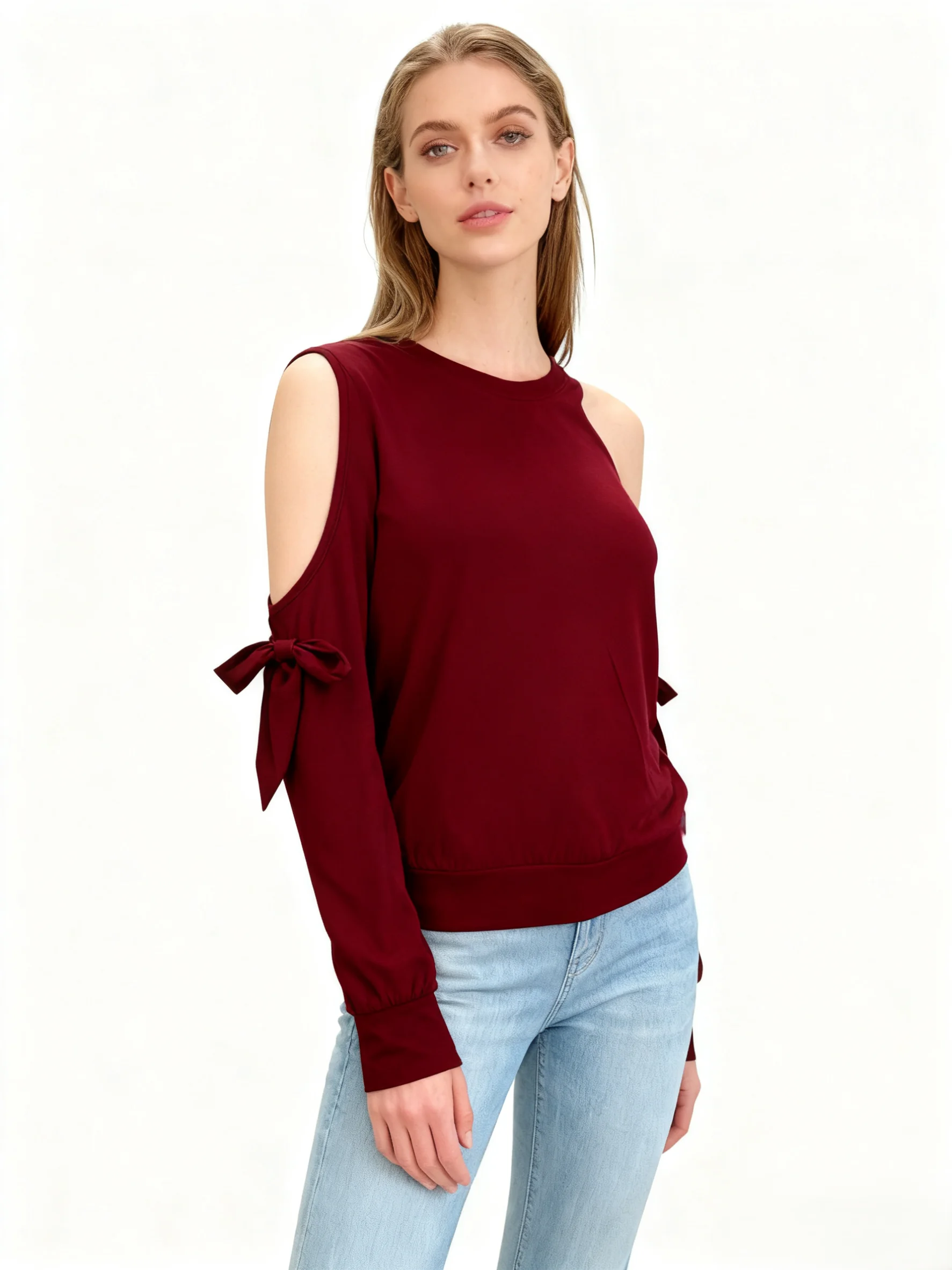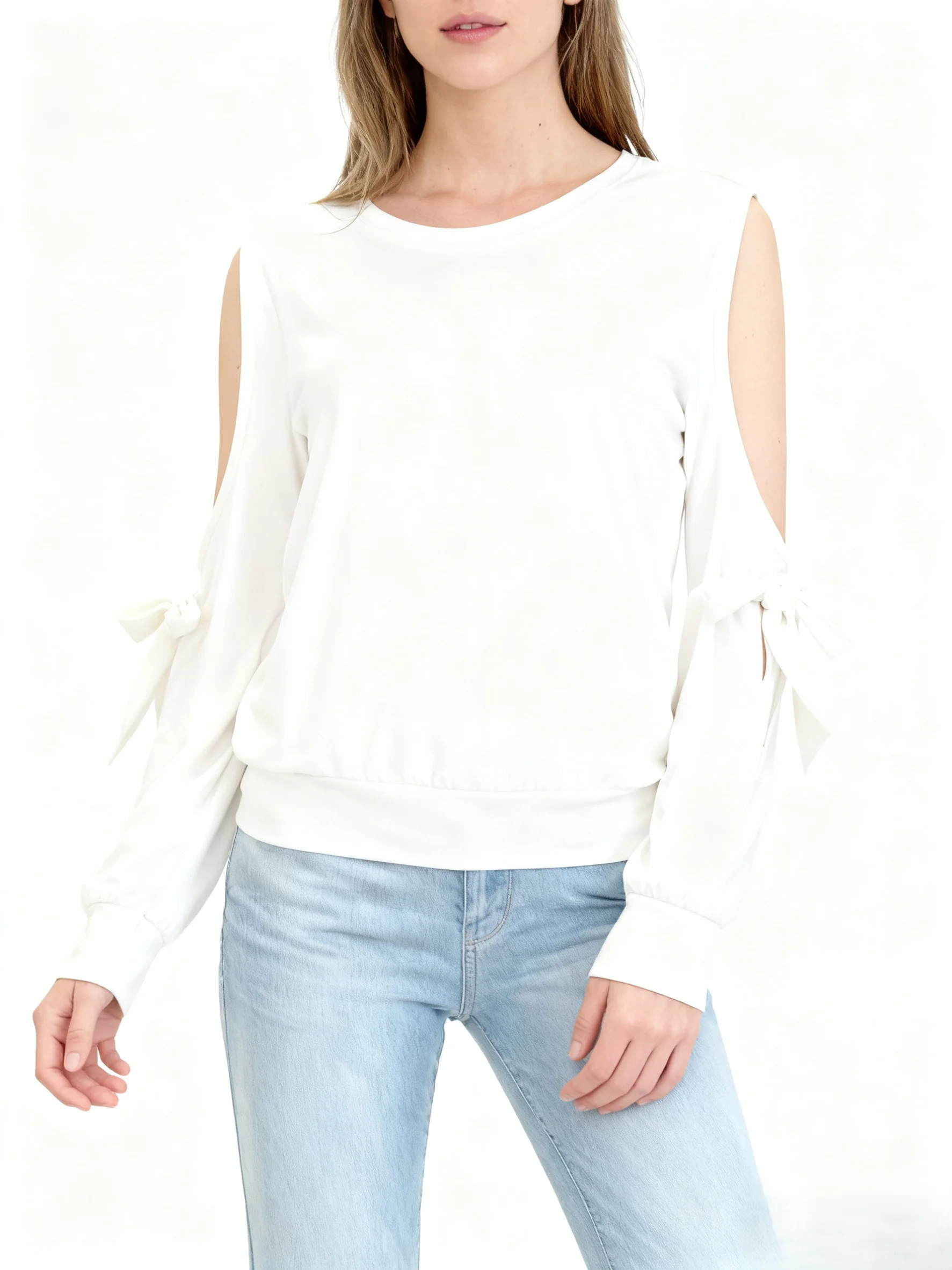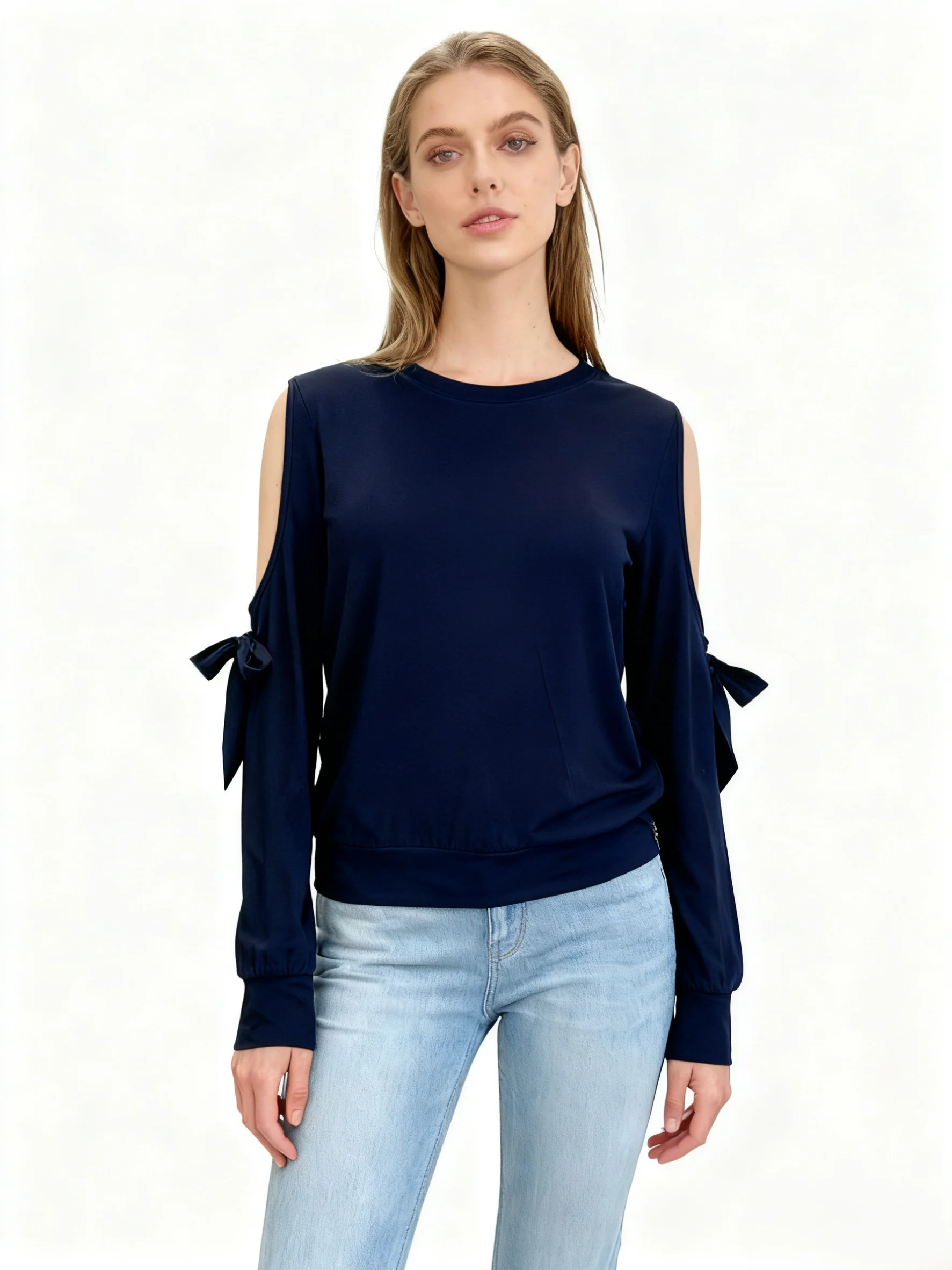 Women's Spring/Autumn Knitted Soft Stretch High Quality Trendy Glam Elegant Stylish Cold Shoulder Tie - Detail Long Sleeve Top